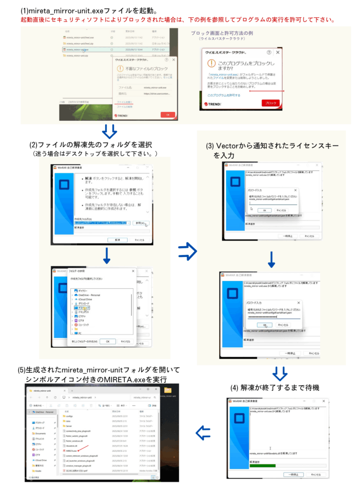 以下に図解した手順に沿って、ファイルを解凍して下さい。